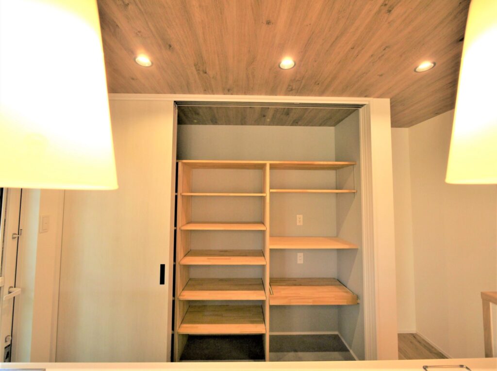 背面に設けた可動棚付きパントリーは、調理家電から日用品のストックまでたっぷり収まる大容量設計です