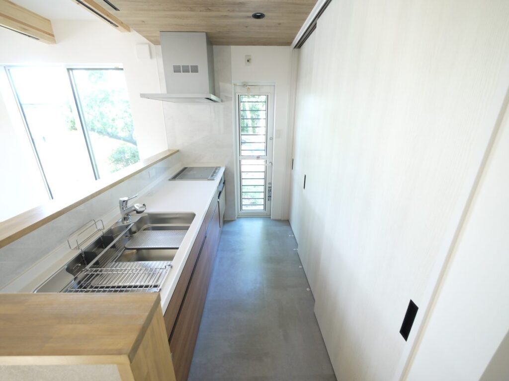 一直線の作業動線でキッチン-パントリー-勝手口へスムーズにアクセスし、家事時間を短縮します