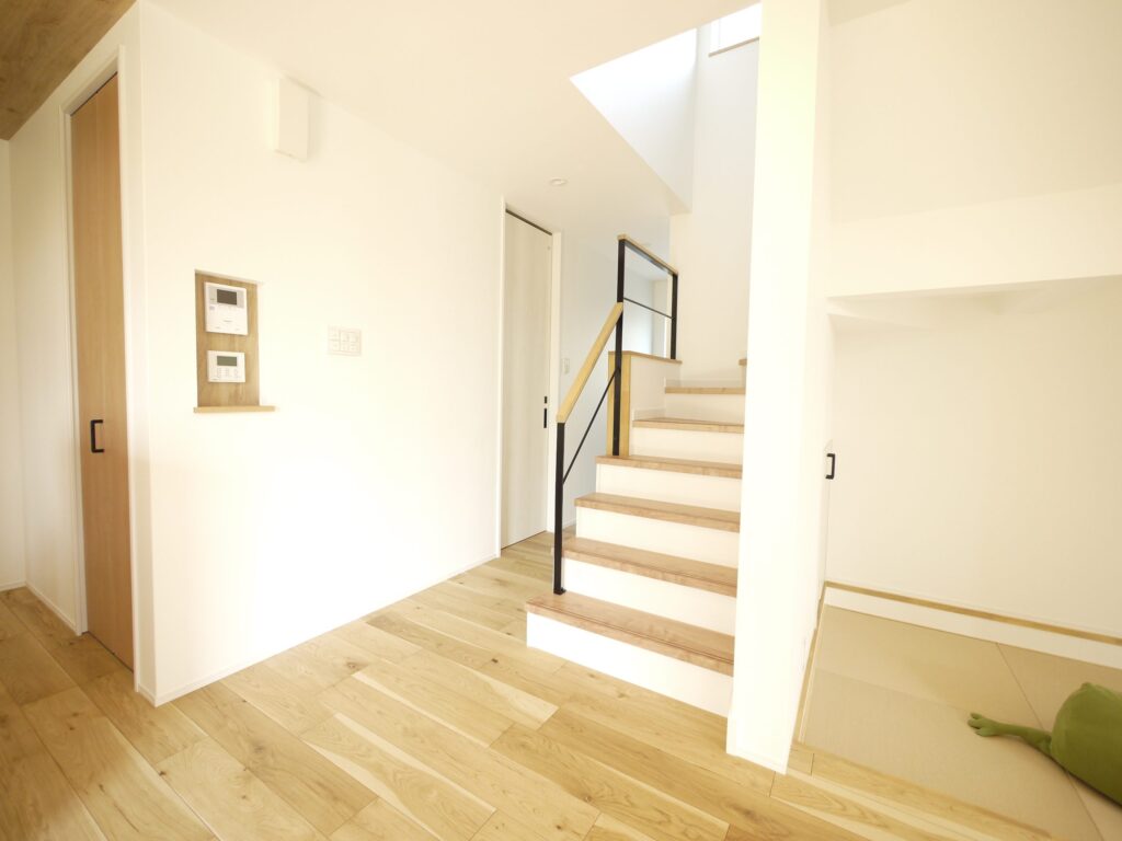家族の集まるリビング階段の壁に、インターフォンとおふろリモコンを木目ニッチへインセット