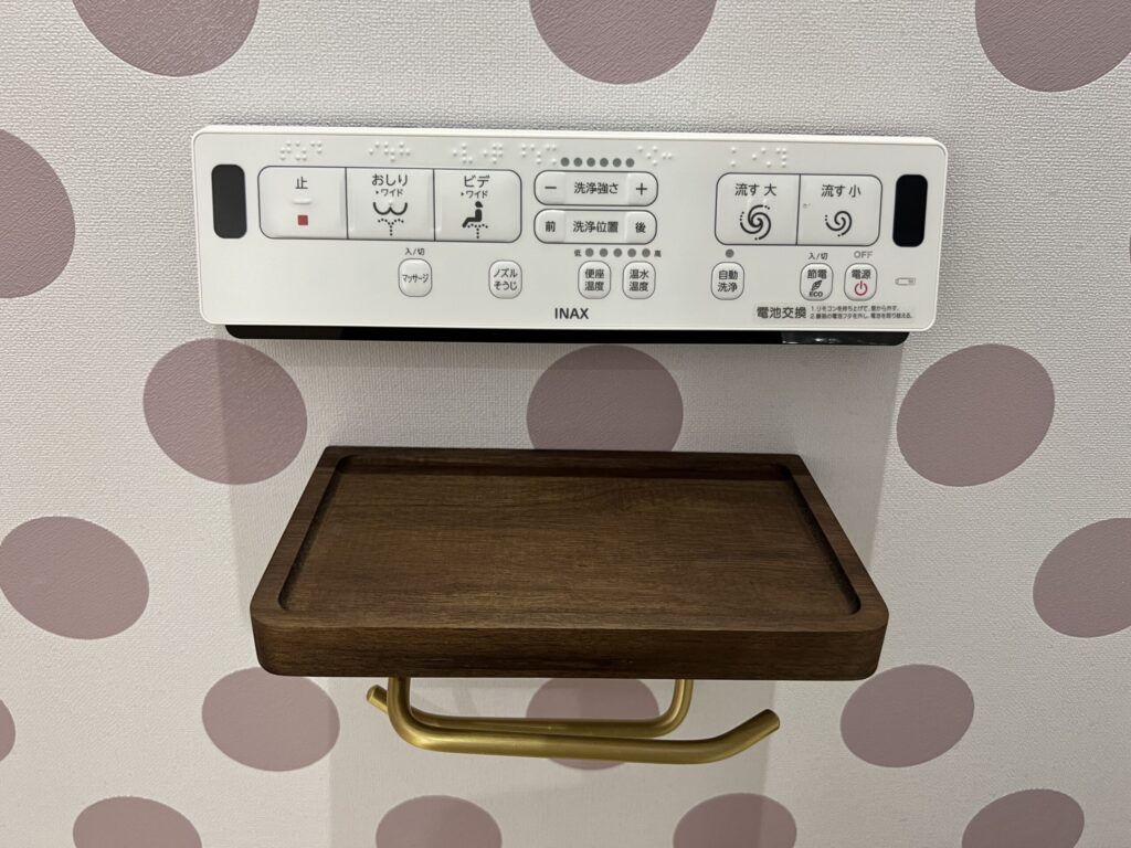 トイレは、やさしいピンクベージュのドット柄クロスが目を引く、北欧テイストの空間です。