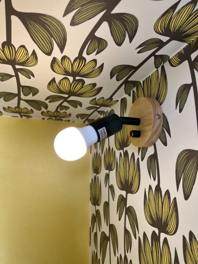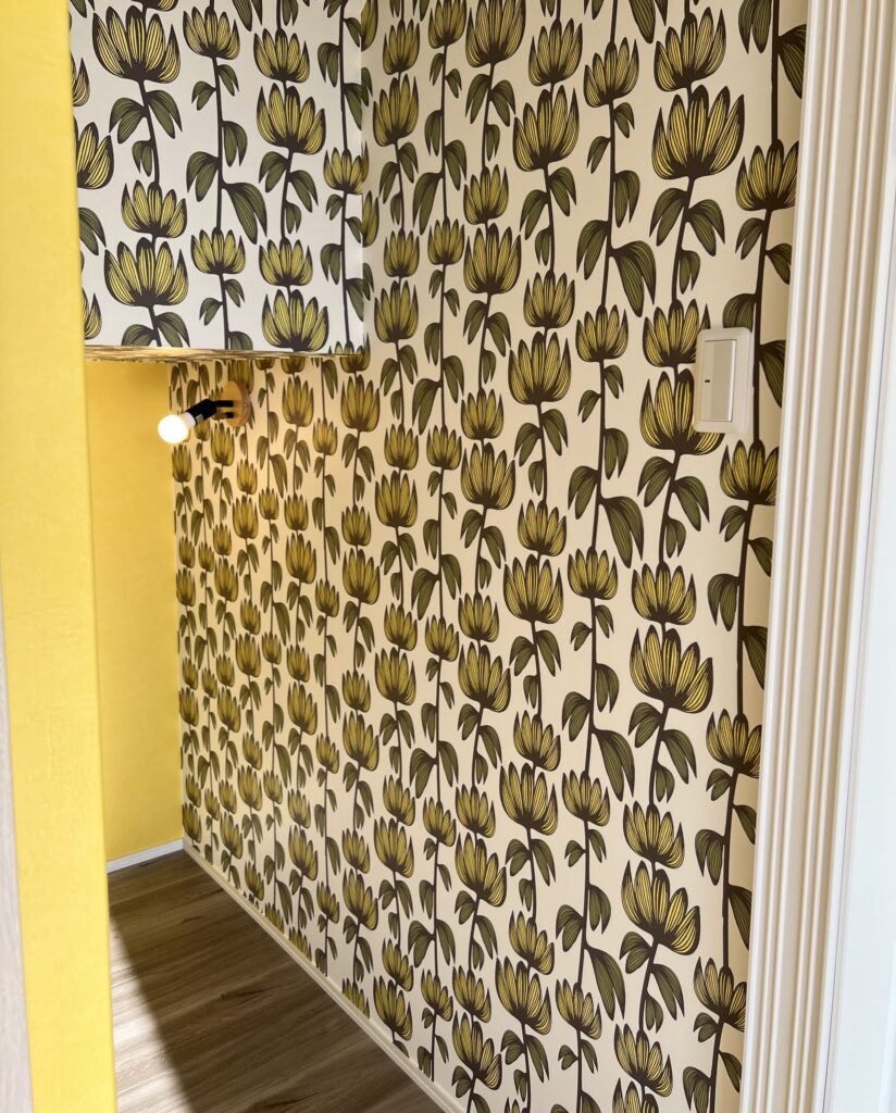 イエローと北欧調のフラワー柄クロス、ポップなブラケットライトを組み合わせた階段下収納は、開けるたびに気分が明るくなる場所。奥まで見通しのよい棚計画で、在庫の管理もしやすくなっています。日々の家事導線上に、楽しく使える収納をちりばめているのが、この家の特徴です。