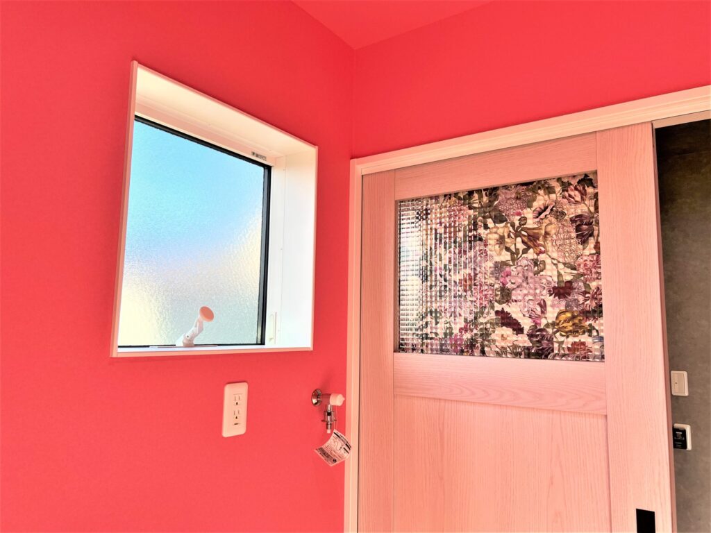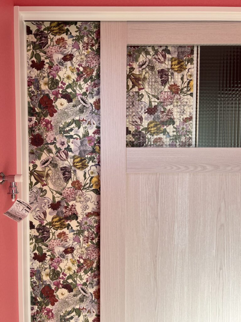 水まわりは、「毎日必ず使う場所だからこそ、自分たちらしさを」という考えのもと計画しました。 脱衣室は、やさしい木目と鮮やかなピンクの壁紙、建具裏には花柄の壁紙を組み合わせた空間です。