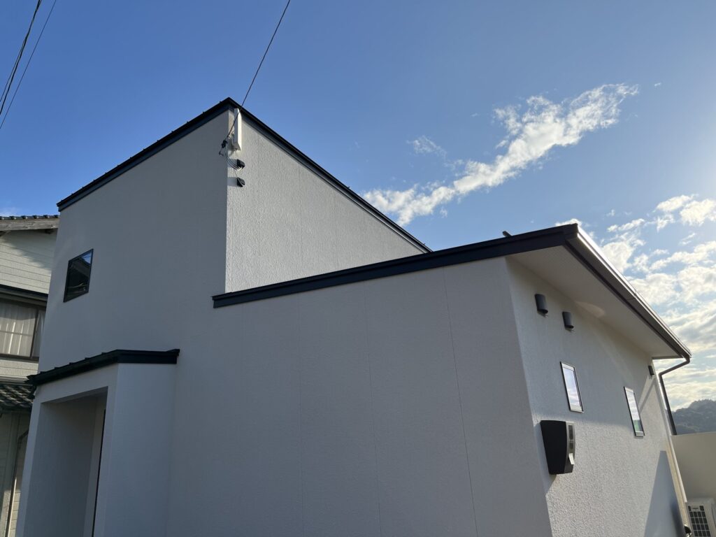 シンプルな箱型×片流れ屋根の外観は、白い外壁に黒のサッシ、木目の玄関ドアが映える、端正で落ち着いた佇まいです。