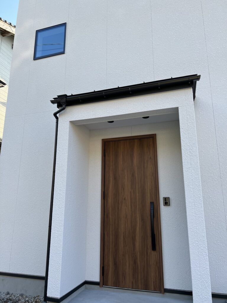 通りからの視線を考えた小窓の配置や、深い庇をかけた玄関ポーチにより、雨の日でも出入りしやすく、夜にはポーチ灯が家族をあたたかく迎えます。
