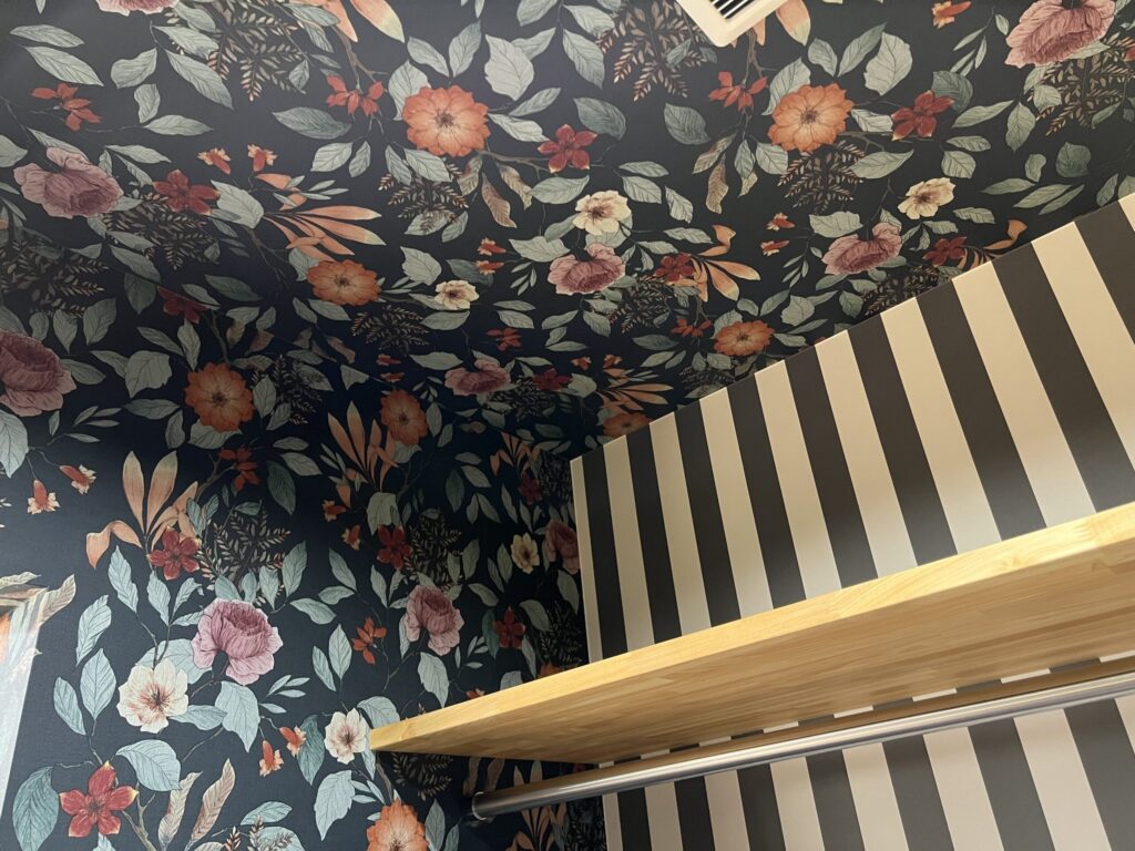 ベースは落ち着いたダークトーンとしつつ、一部に花柄やストライプを組み合わせることで、朝の身支度が少し楽しくなるような雰囲気に。ハンガーパイプでご夫婦とお子さまの衣類を分けながら、小さなスペースでも効率よく収納できるよう工夫されています。
