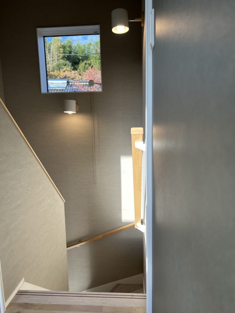 玄関から続く階段ホールは、高窓から差し込むやわらかな光が印象的です。