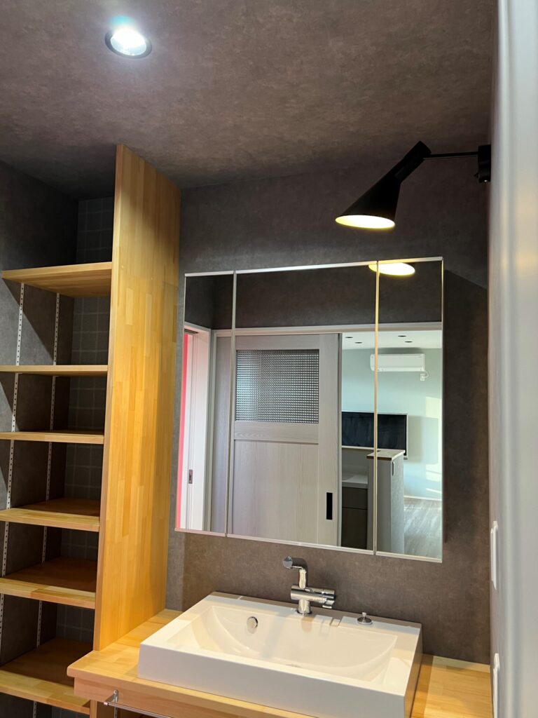 隣接する造作洗面所は、グレートーンの壁とマットブラックのスポットライト、木のカウンターで、ほどよく落ち着いた印象に。