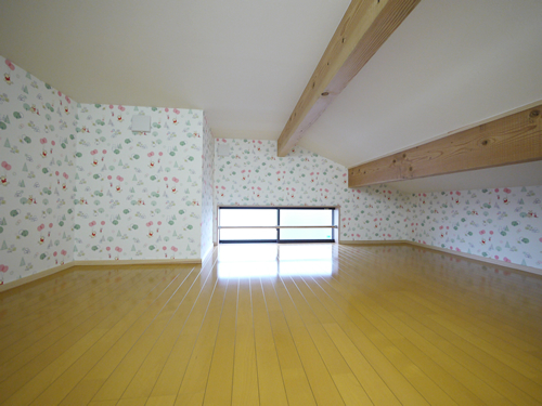 2階の部屋は、はじめはセカンドリビングとして使い、子供たちに個室が必要になったときには壁などで仕切ることのできるようしてあります。また、その上には折りたたみ式の階段で上がれる屋根裏収納があります。