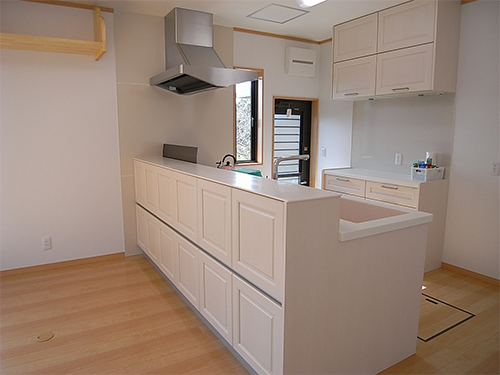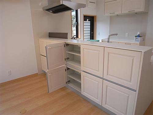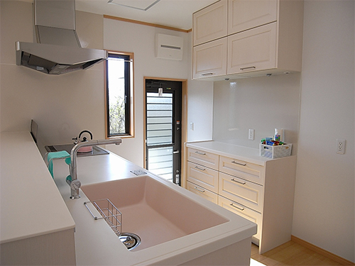 フレンチヨーロピアンな内装は、奥様がセレクト。キッチンのシンク、お風呂、トイレを淡いピンクにまとめて、全体はホワイトで統一感があります。さらに、キッチンのカウンター収納には、デザインも含めてこだわりがつまっています。家全体で統一感を持たせつつ、こだわりポイントを散りばめられるのも、注文住宅の魅力のひとつです。LDKの入り口には、ねこちゃんが自由に出入りできる扉を配置。かわいいご家族もきっと満足でしょう。
