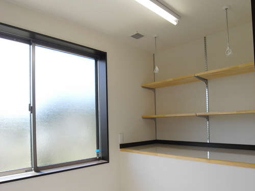 キッチンの後ろには勝手口からも入れる食品庫もあり、ごちゃごちゃしがちなキッチンまわりもすっきり。ただ暮らしやすいだけではなく、見た目にもプラスに働く設計の妙です。
