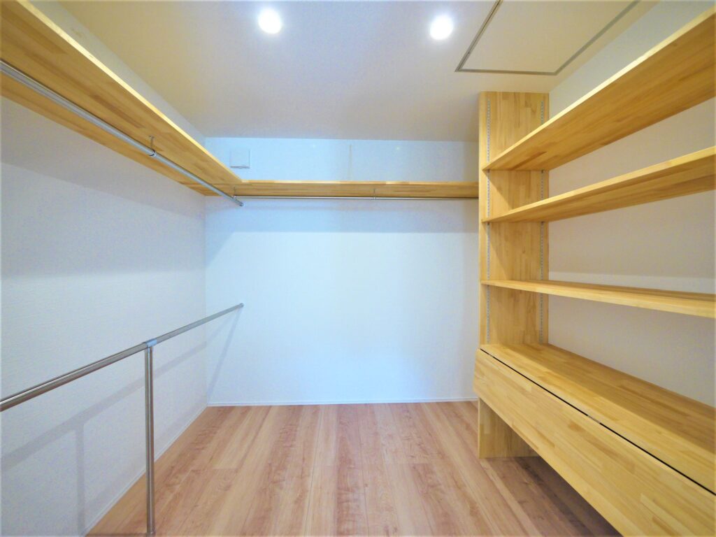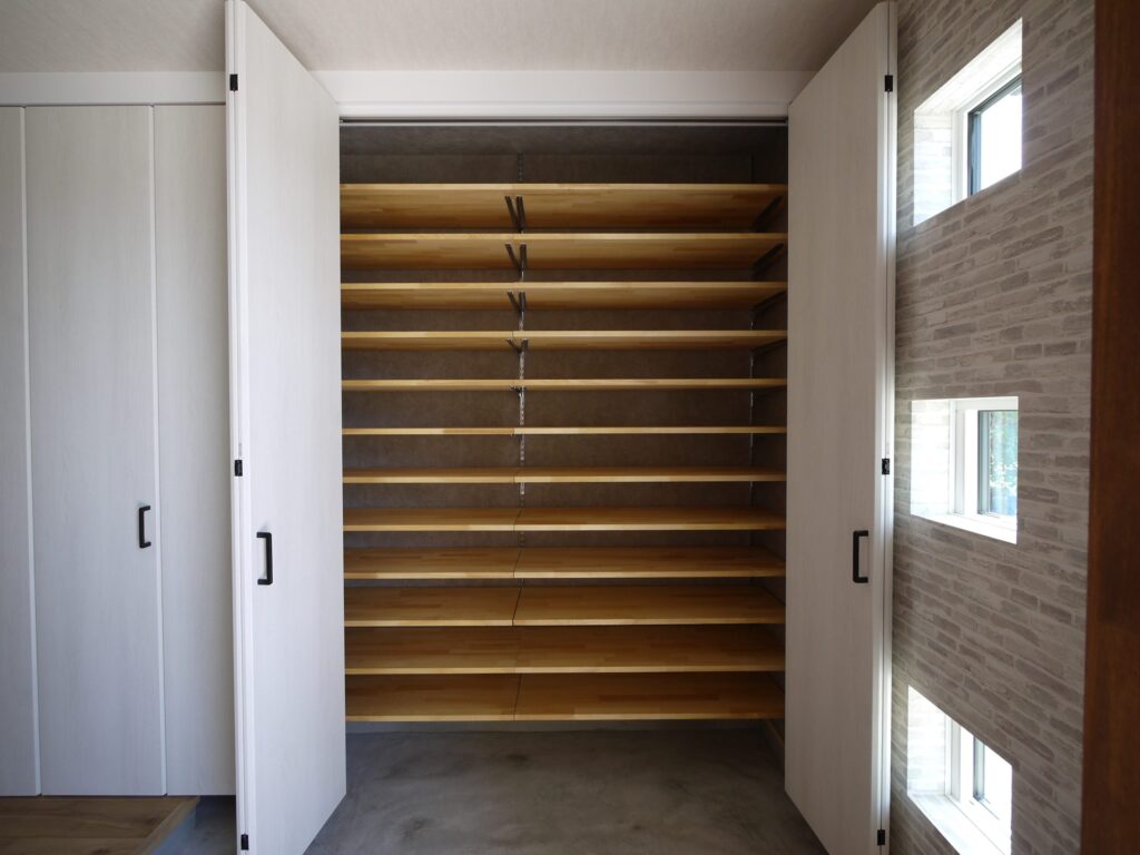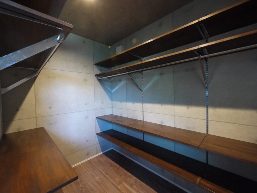 スニーカーやジーンズなど、コレクションしているたくさんの「大好き」なものを綺麗に収納したいというご相談を形にしました。シューズクロークは玄関からリビングまでの壁一面に。ファッション関連のものは単独のクローゼットに。一般的にウォークインクローゼットは一家族に一つが多いですが、こちらでは多数設けて、大人のための個室を造りました。