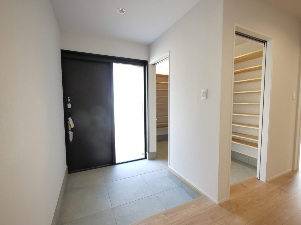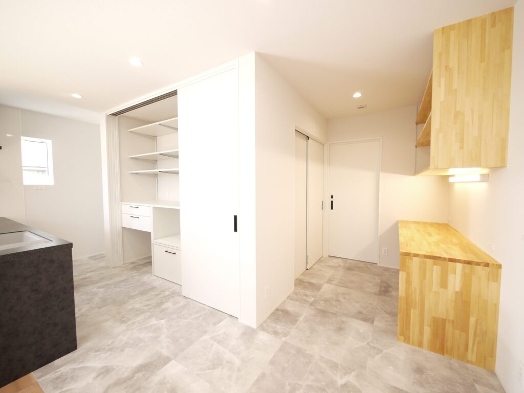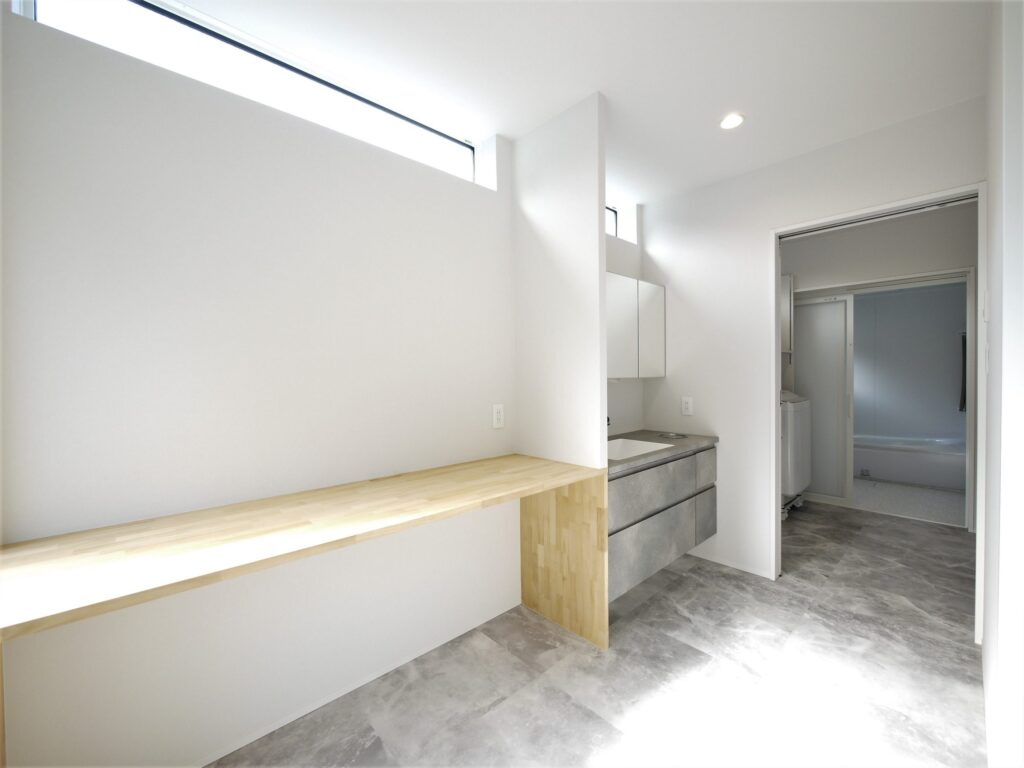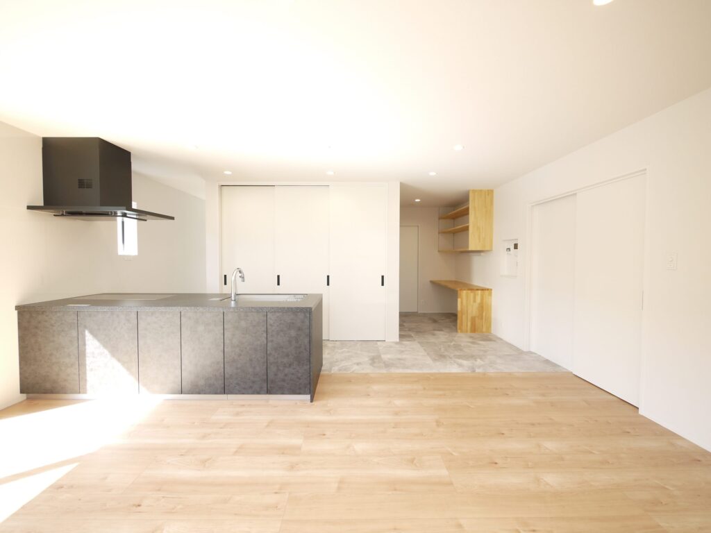 大容量の収納を備えた玄関をあがると本格的なホームパーティができる程のLDKが広がります。キッチン裏は収納と水回りがあり、ぐるっと一周できるようになっています。家事スペースも広々。ガス乾燥機を装備しており雨の日の洗濯物もしっかり乾かせます。