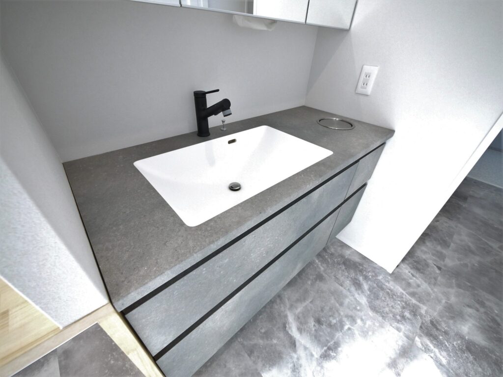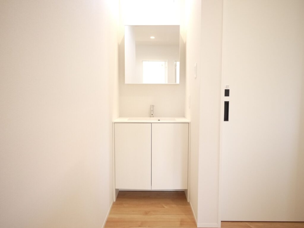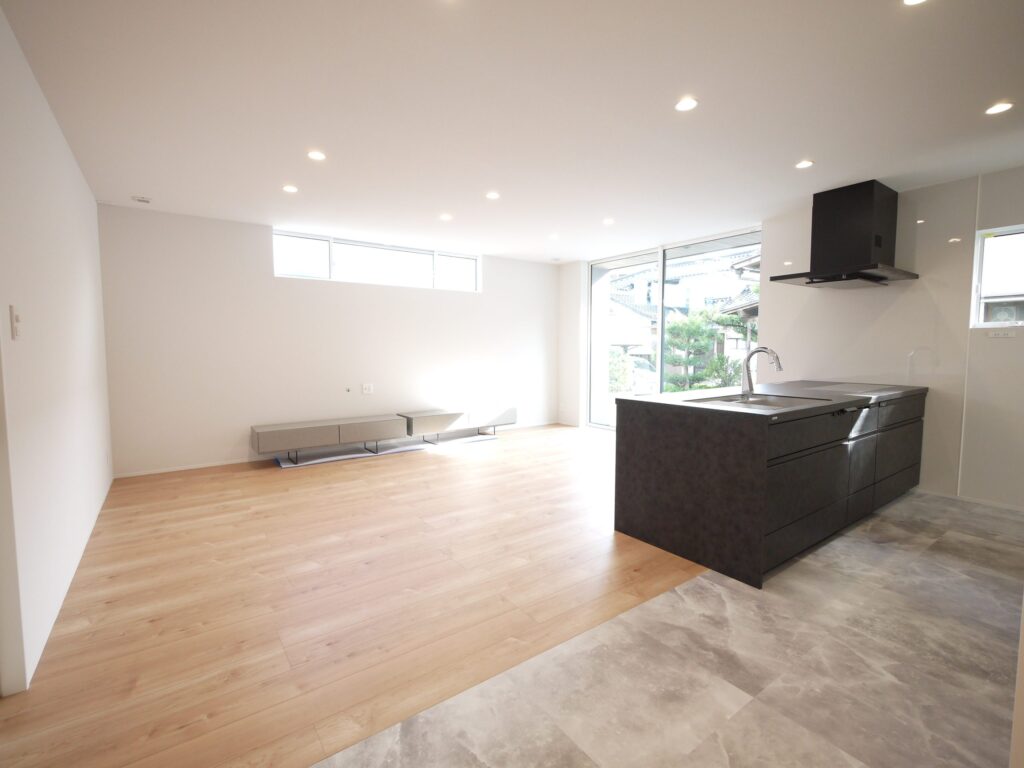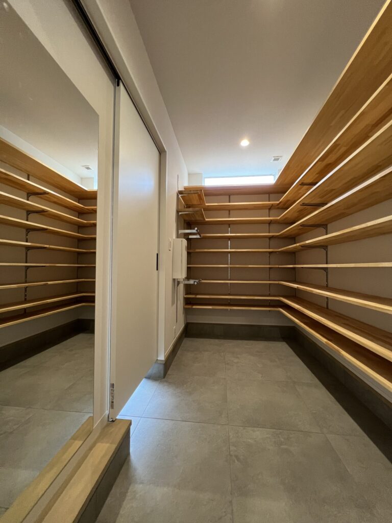 大容量の収納を備えた玄関をあがると本格的なホームパーティができる程のLDKが広がります。キッチン裏は収納と水回りがあり、ぐるっと一周できるようになっています。家事スペースも広々。ガス乾燥機を装備しており雨の日の洗濯物もしっかり乾かせます。