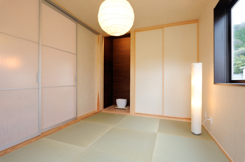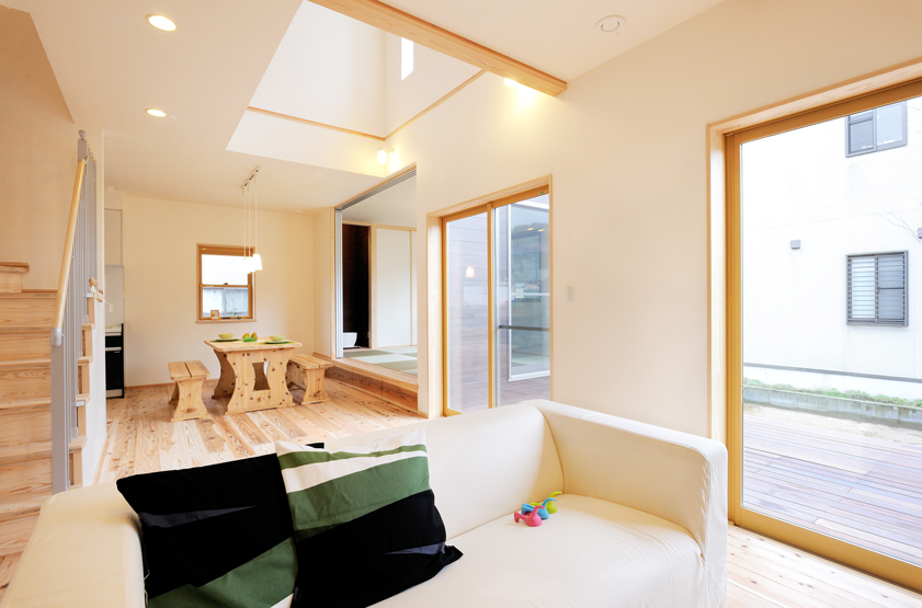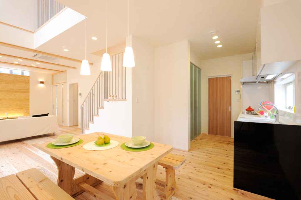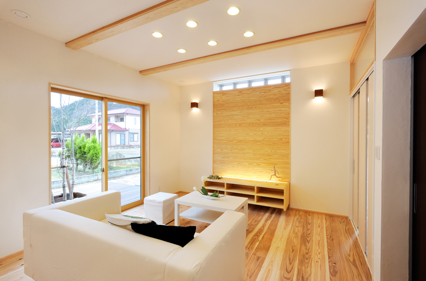 スーパーウォール工法を採用し、地震に強くて夏涼しく冬暖かい頑丈な構造になっています。同時に長期優良住宅に適合し、県産材をふんだんに使用していますので、環境にもやさしいエコ住宅です。内装はオススメの「幻の漆喰」の壁や「うづくり」の杉板のフロア、地元青谷産の和紙の壁紙などを使用し、古くから伝わる天然素材を体感していただけます。日本の風土でより快適に、自然災害に強い構造で安心を肌で感じていただけると思います。