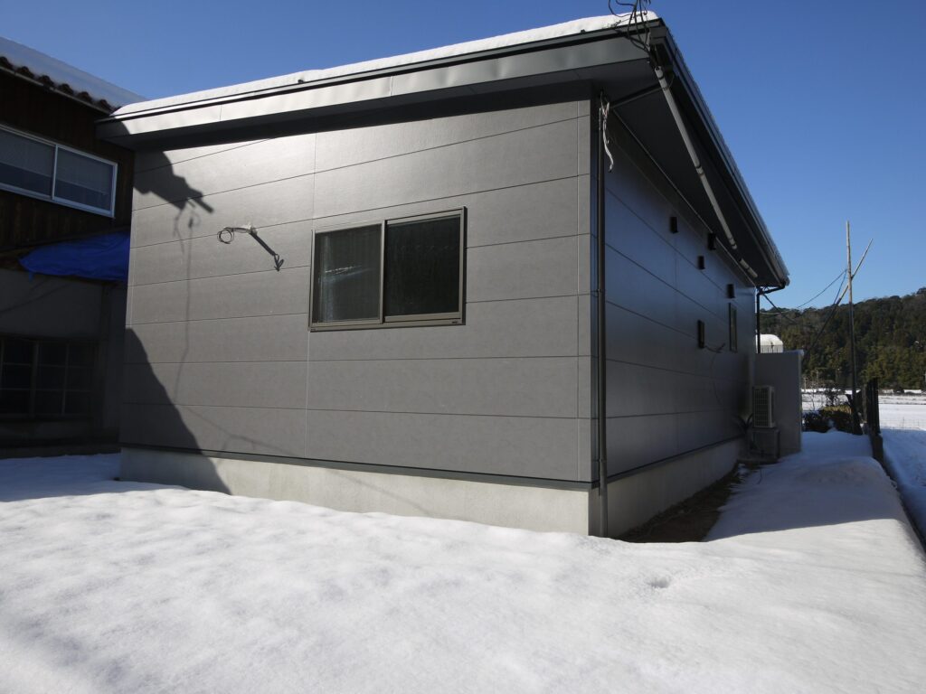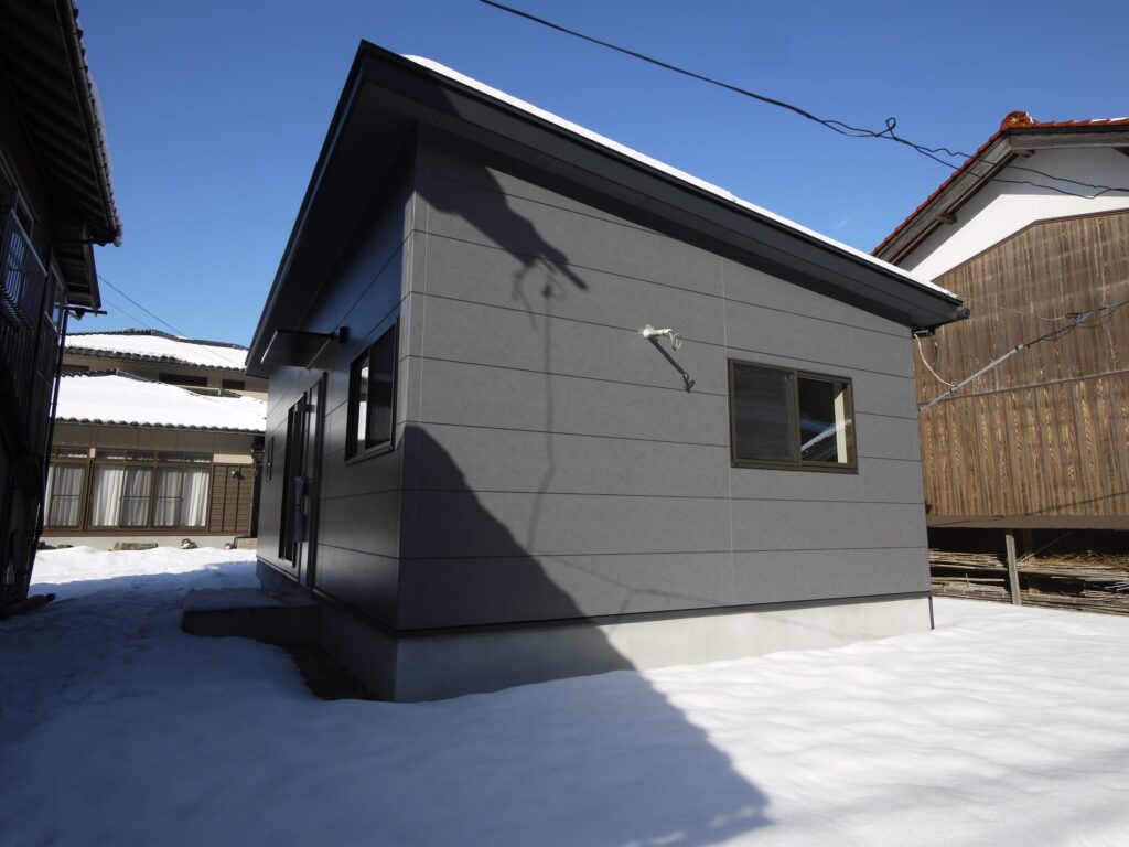 段差ゼロのワンフロアで、家事動線を短縮し家族が自然と集まるリビングへ。シンプルなグレー外壁は雪国ならではの景色と調和し、一年を通して美しさをキープ。限られた床面積でも贅沢な回遊動線と収納計画で、30代のライフスタイルにフィットするゆとりを生み出しました。