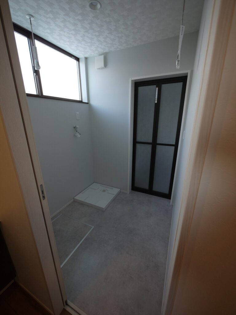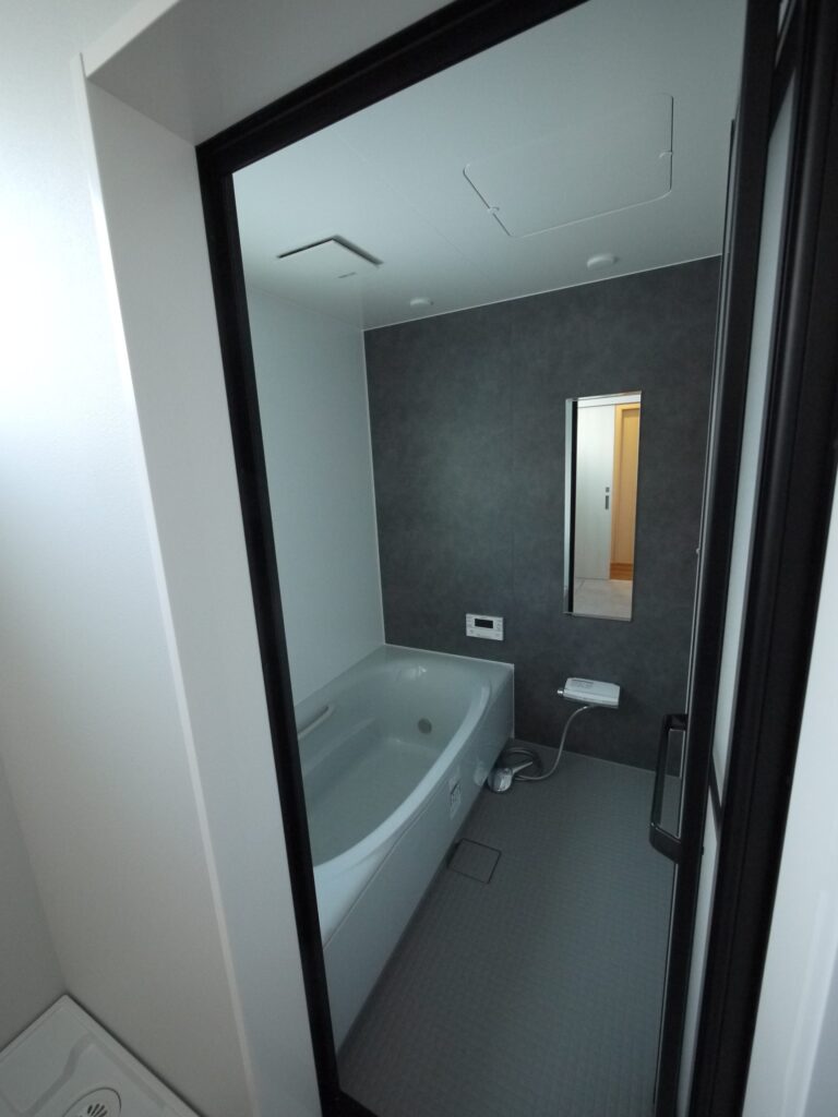 共働きで忙しい30代夫婦の毎日に、掃除の手間を最小化するモノトーン水まわりをデザインしました。汚れが目立ちにくいグレーの床とブラックの格子扉が空間を引き締め、白いワイド浴槽でリラックスタイムも贅沢に。洗濯機スペースと繋がるランドリールームにはハイサイド窓から自然光と風が入り、衣類が早く乾くのも嬉しいポイント。防カビパネルとフラット床で、毎日の掃除は“サッと一拭き”。家事負担を減らし、家族の時間を増やす住まいです。