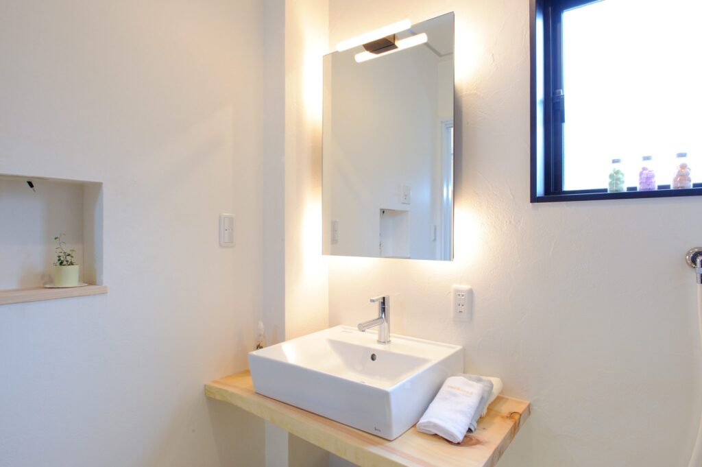 正方形の深型ボウルをセットした造作洗面台は、水はねを抑えつつ掃除も簡単。壁は調湿効果のある漆喰仕上げで、鏡裏に電源を隠して生活感をミニマムに。高気密高断熱の住まいと組み合わせれば、冬でもヒヤッとしない快適さを保ちます。