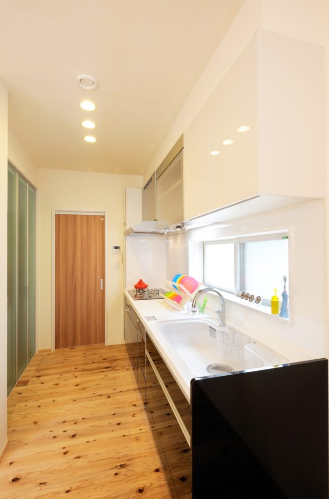 足元には節目が美しい無垢板フロアを敷き、自然素材ならではの温もりと心地よさをプラス。毎日のキッチンワークを“時短”と“癒やし”で支える空間です。