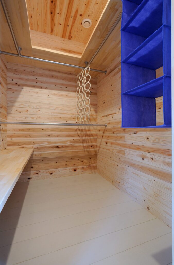 クローゼット内部は杉板仕上げ。調湿・消臭効果に加え、森林浴のような香りがリラックスを誘います。衣類をたっぷり掛けられる2段パイプと可動棚で季節替えもらくらく。
