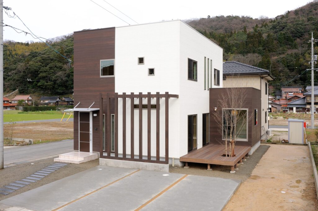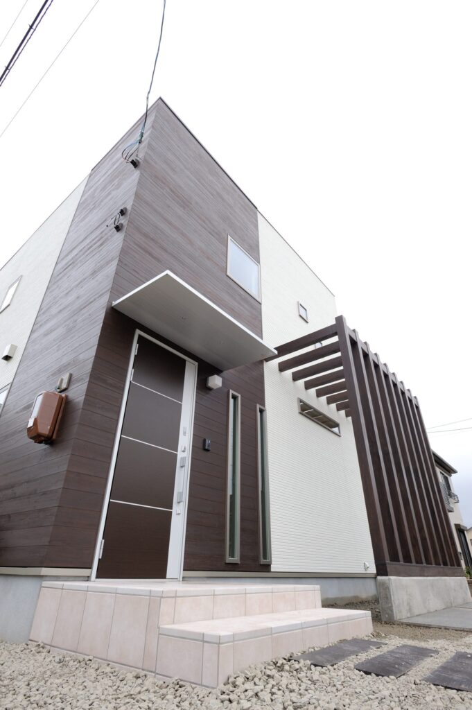 ブラウンの木調と真っ白な外壁が街並みに映え、長期優良住宅認定で将来の資産価値も守ります。
