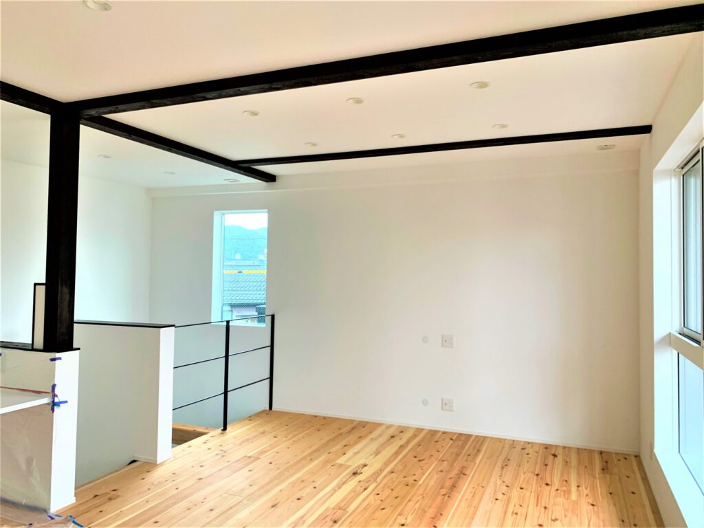天井を走るブラック梁とアイアン手摺が空間を引き締め、白い壁にアートのようなアクセントをプラス。