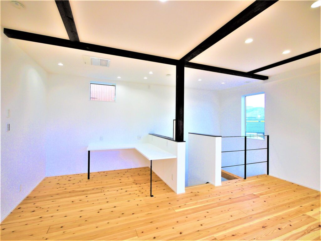 高窓から届く柔らかな光と、杉の無垢床が生む心地よい温熱環境で、リビング学習やリモートワークも集中できます。