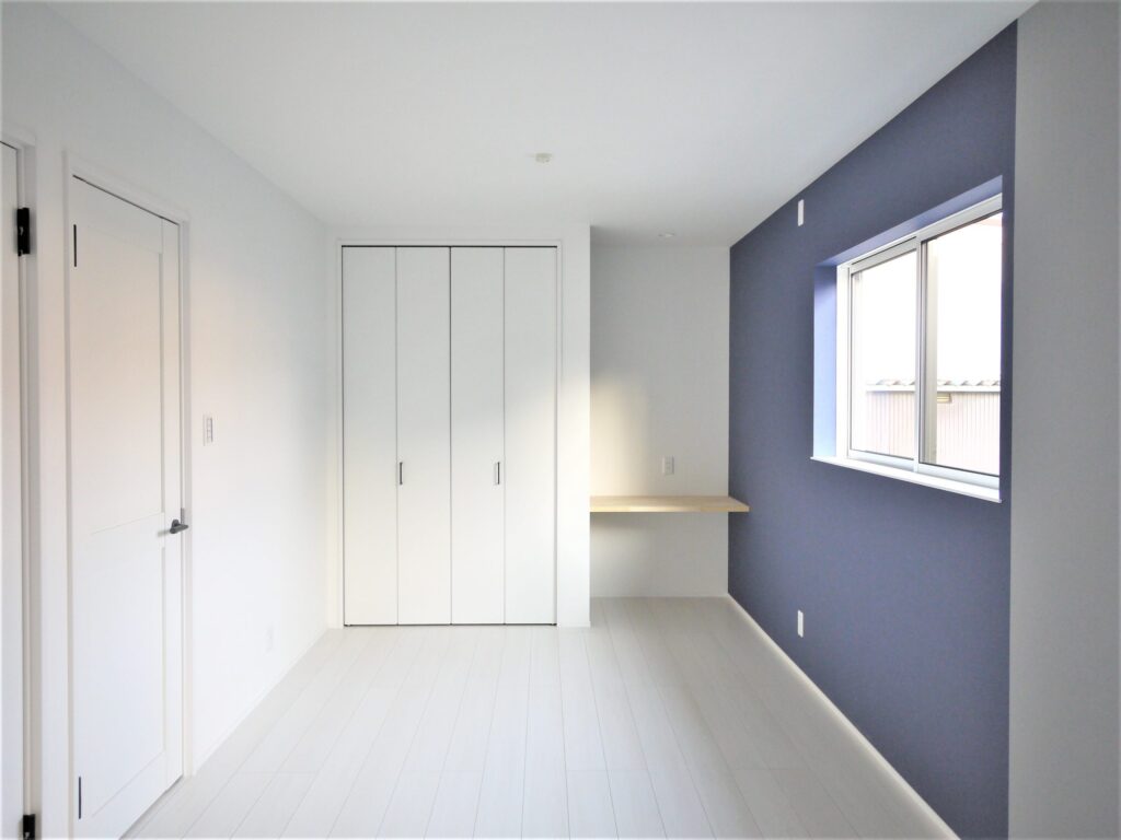 落ち着いたネイビーブルーのアクセントが感情を穏やかに整え、白で統一した床と大容量クローゼットが光を広げて視界をすっきり演出。