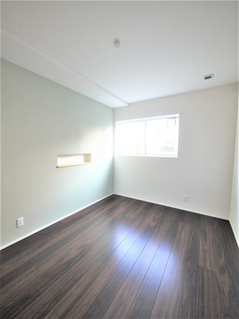 淡いグリーンのアクセントウォールと重厚感あるダークフロアが織りなすコントラストが、ホテルライクな上質感を演出します