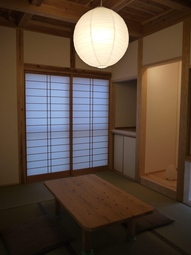 無垢杉の天井梁と畳の質感が、客間としてはもちろん家族団らんのリビングとしても心落ち着くもてなしを実現
