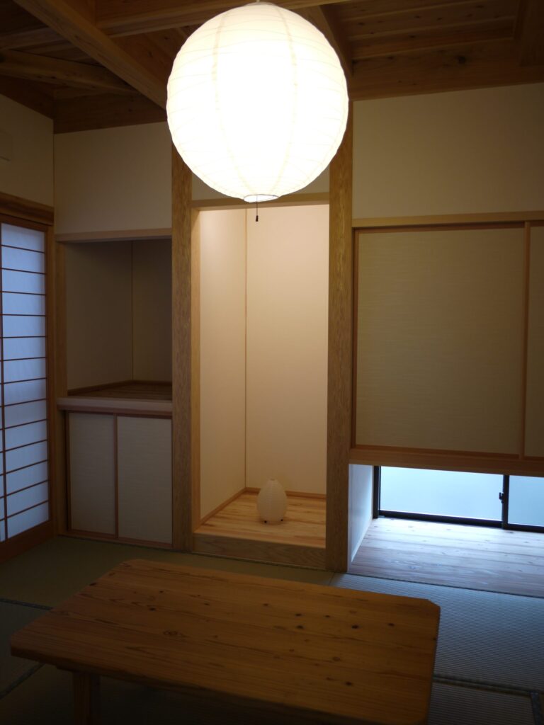 障子越しのやわらかな光と地窓から差し込む低い光が織りなす陰影が、季節の雛飾りや五月人形を引き立てる床の間を演出します