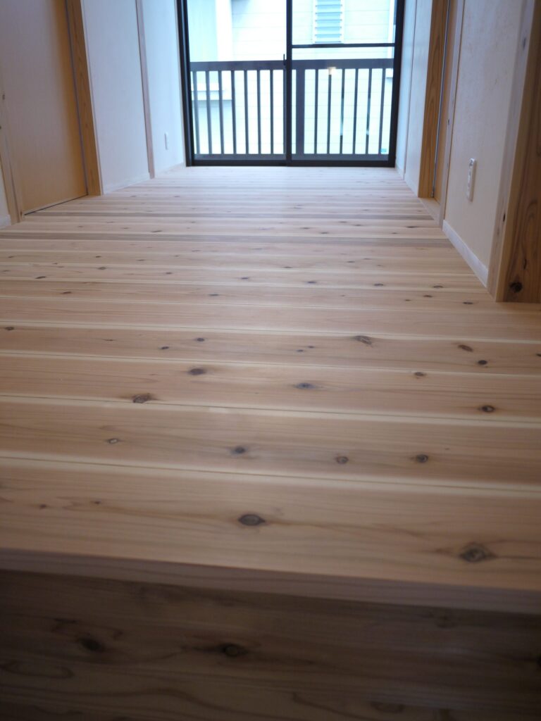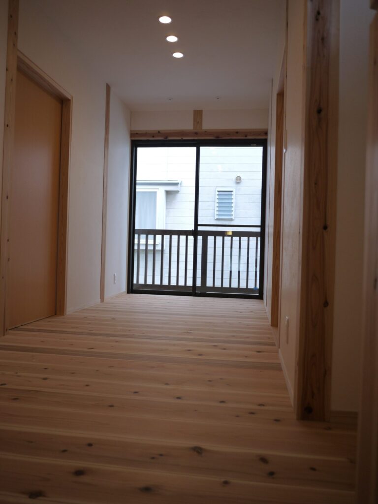 2階廊下と居室をつなぐこのスペースは、一歩ごとに森林浴の香りと調湿効果をもつ音響熟成木材が、家族の毎日を快適に支えます