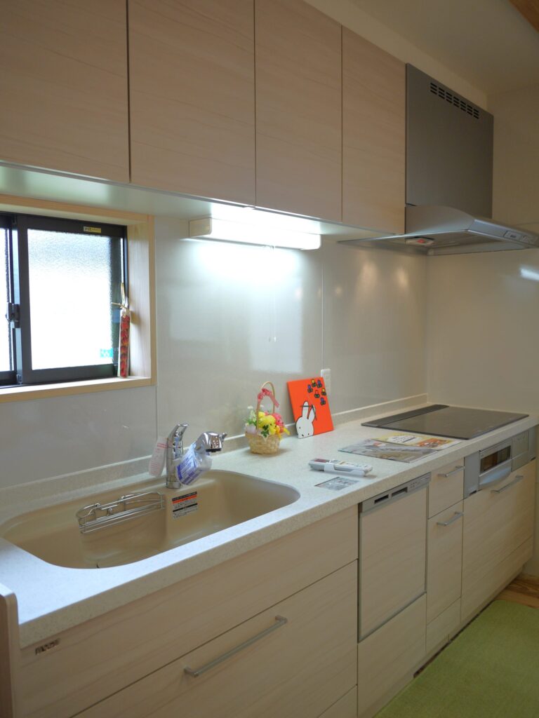 壁付けキッチンは視線がリビングへ抜けるため、料理をしながら家族とコミュニケーションが取れる設計