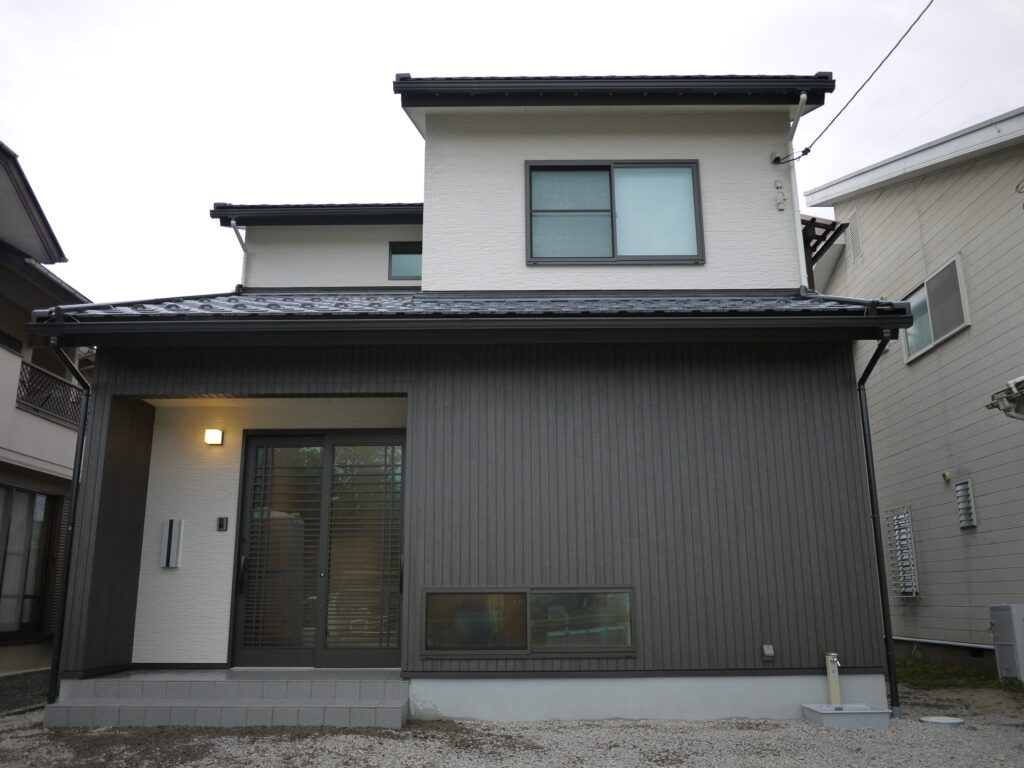 白と黒のツートン外壁が街並みに映え、深い軒と水平ラインが日本家屋の落ち着きを演出します。