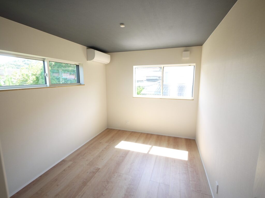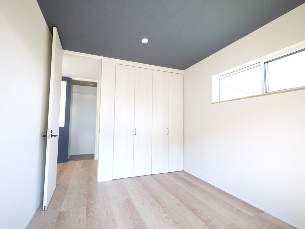 ホワイトの壁とライトオークの床にネイビーブルーの天井を合わせ、6帖でも奥行きと落ち着きを演出